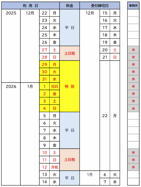 12月29日(月)~1月4日(日)は特別料金となります。別途お問合せください。
